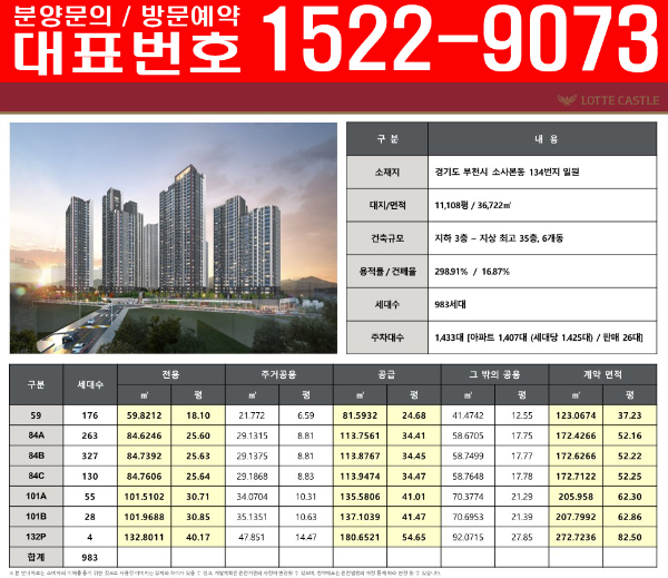 전용 59 제곱, 84 제곱, 101 제곱, 132 제곱 등 총 7개 타입으로 구성되며 총 983세대 명품 브랜드 아파트를 만나보세요. 잔여호실 확인은 신속하게 연락 주셔야 합니다. 소사역 더블역세권을 누리는 쾌속 교통의 중심, 생활인프라와 초중고의 우수한 교육환경에 부천의 첫 번째 롯데캐슬 브랜드를 만나보세요.